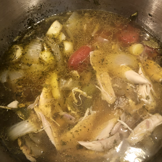 About 45 minutes prior to wanting to serve, peel and cube the potatoes. I recommend pulling the chicken out of the pot if possible to debone it and add the meat back in. Be careful not to let it cook in the soup for too long or it'll just fall apart when you try to remove it. It isn't the end of the world if you don't, you'll just have to be extra careful you don't eat a bone when you serve it. Drop the potatoes into the soup. Boil salted water for the noodles. Cook the noodles to your desired doneness and drain them in the collander. Rinse with cold water to prevent them sticking and continuing to cook in the colander. When the potatoes are soft when pierced with a fork, the soup is ready to eat! Just a quick note... when re-heating left overs, the potatoes will sometimes absorb a lot of liquid. Add a little water and heat if there's not a lot of broth. The water will help draw the liquid broth back out. Don't add too much, just a little! Mangia!